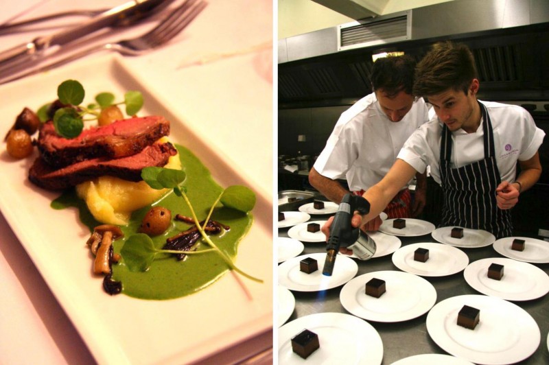‘Sirloin of beef’ – Cooked over charcoal with, caramelised baby onions mushrooms & watercress sauce;